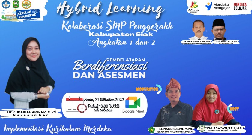 Kegiatan yang ditaja oleh SMP Penggerak Kabupaten Siak angkatan 1 dan 2. Memberikan pencerahan bagaimana memberikan pemahaman kepada guru dalam melaksanakan pembelajaran berdiferensiasi dan melakukan asesmen dalam pembelajaran.