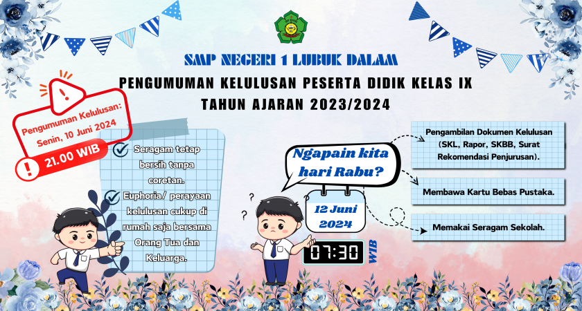 Kurang lebih 3 tahun sudah ananda peserta didik kelas IX Tahun Ajaran 2023/2024 menempuh pendidikan dengan FULL KURIKULUM MERDEKA dan inilah pertama lahirnya ananda peserta didik hebat KURIKULUM MERDEKA dari SMP NEGERI 1 LUBUK DALAM.